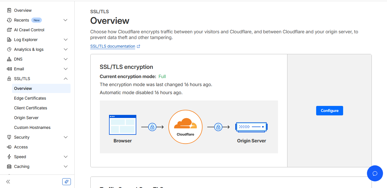 - Dari Cloudflare, pilih domain, pilih menu SSL/TLS-Overview, klik Configure