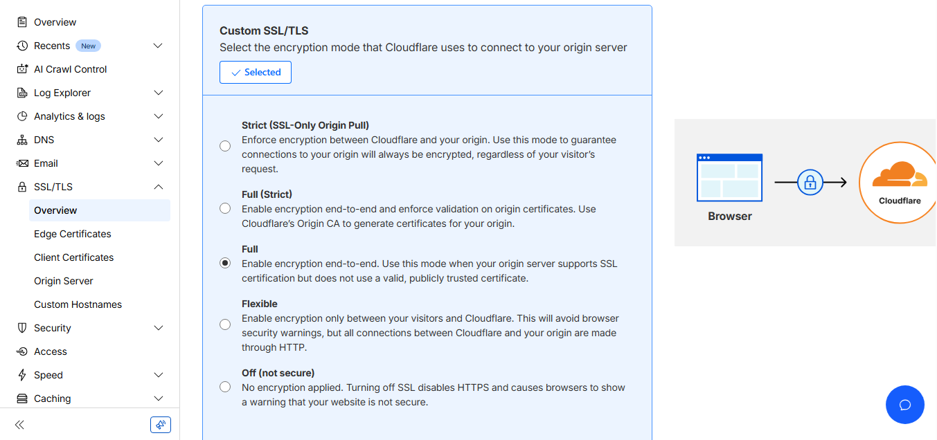 - Pilih Custom SSL/TLS, pilih Full, lalu Save.